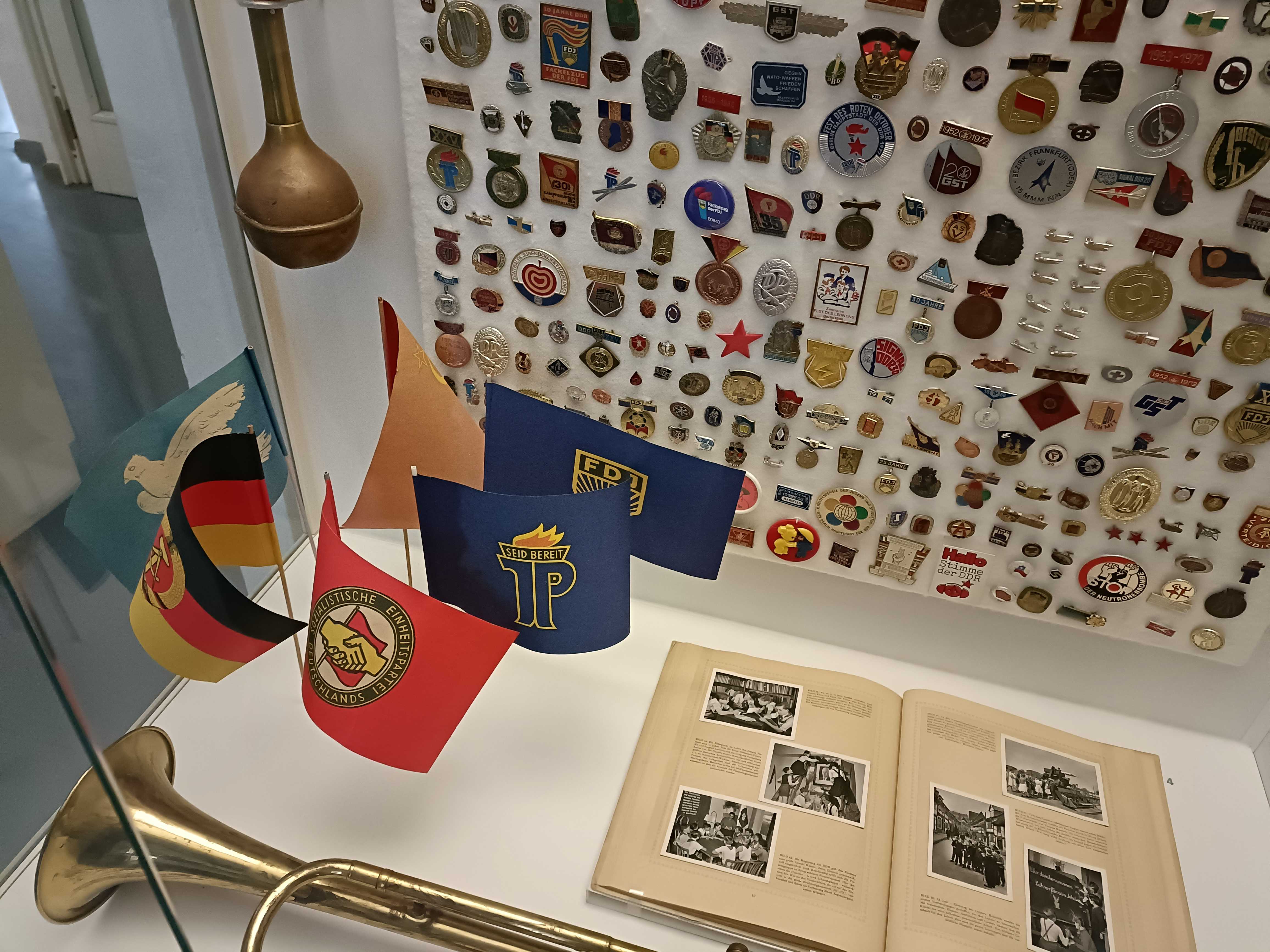 |  | | Kolekcja znaczków i flag - widzimy tu charakterystyczne symbole takich organizacji jak SED, JP, FDJ | |
