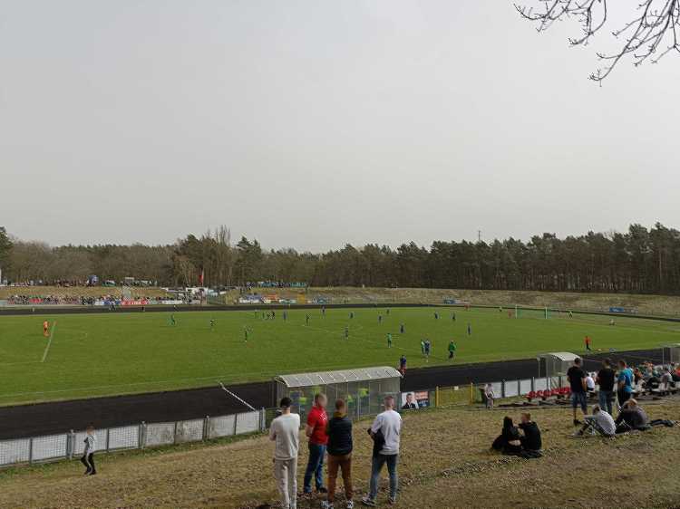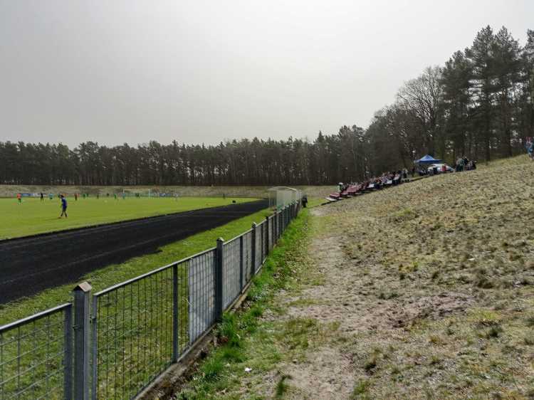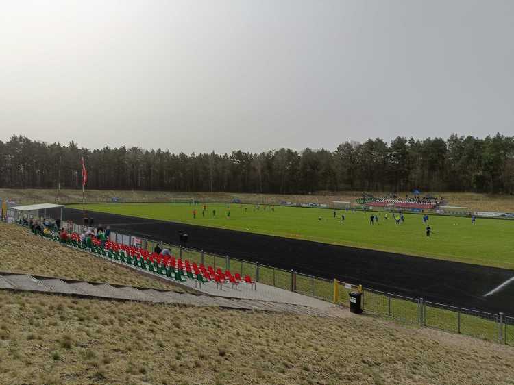 |  | | Trybuna wschodnia - zdjęcie bardzo dobrze unaocznia jak daleko jest z trybun (szczególnie ze szczytu wału) do linii bocznej boiska | |