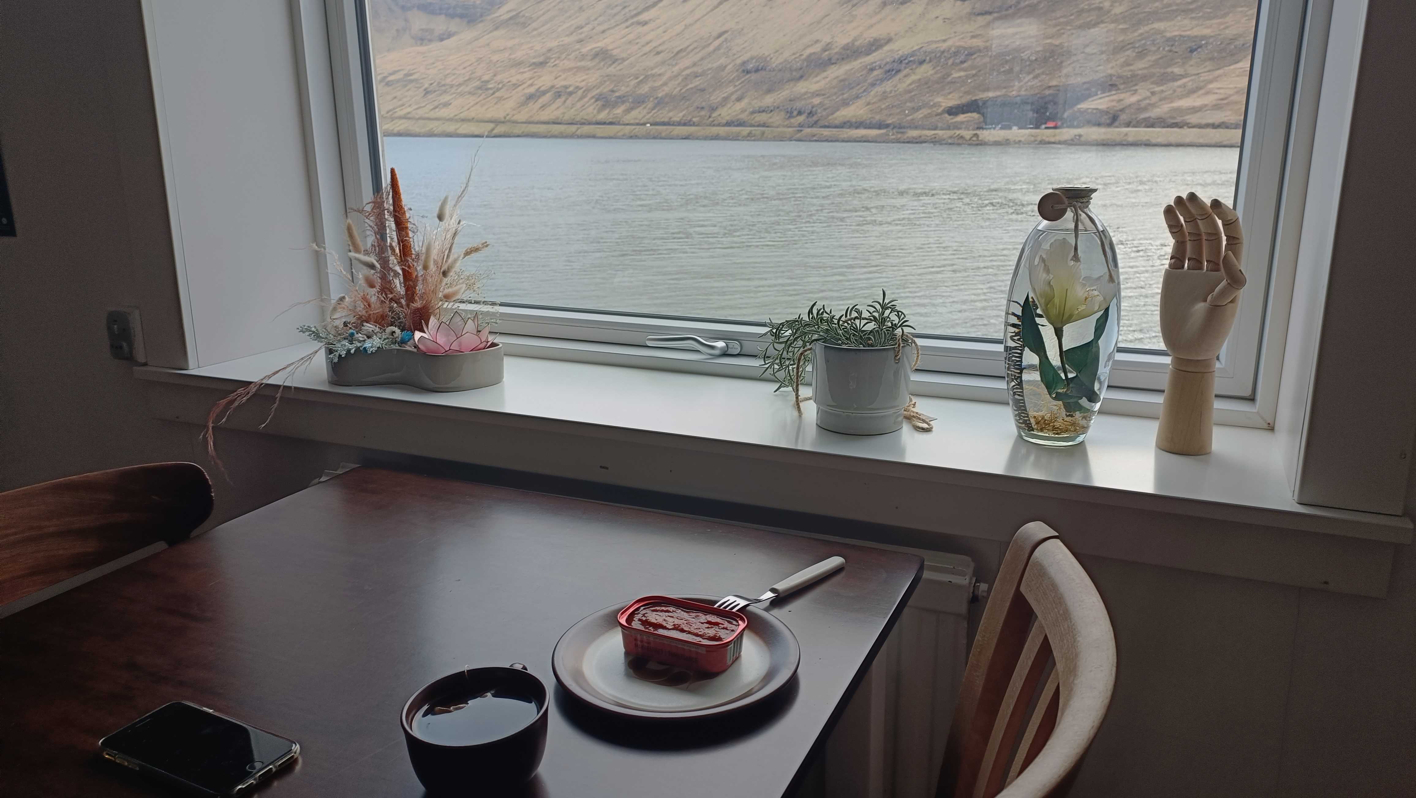 |  | | Śniadanko w hostelu - najtańsza rybna konserwa i przepiękny widok z okna | |