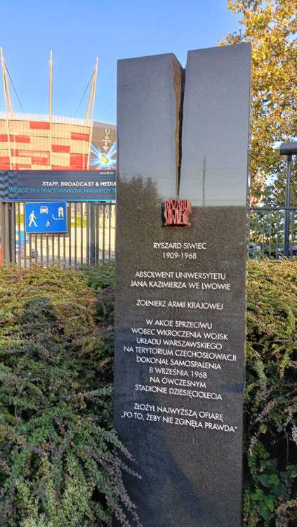 |  | | Pomnik upamiętniający Ryszarda Siwca, który dokonał samospalenia na starej wersji Stadionu Narodowego | |