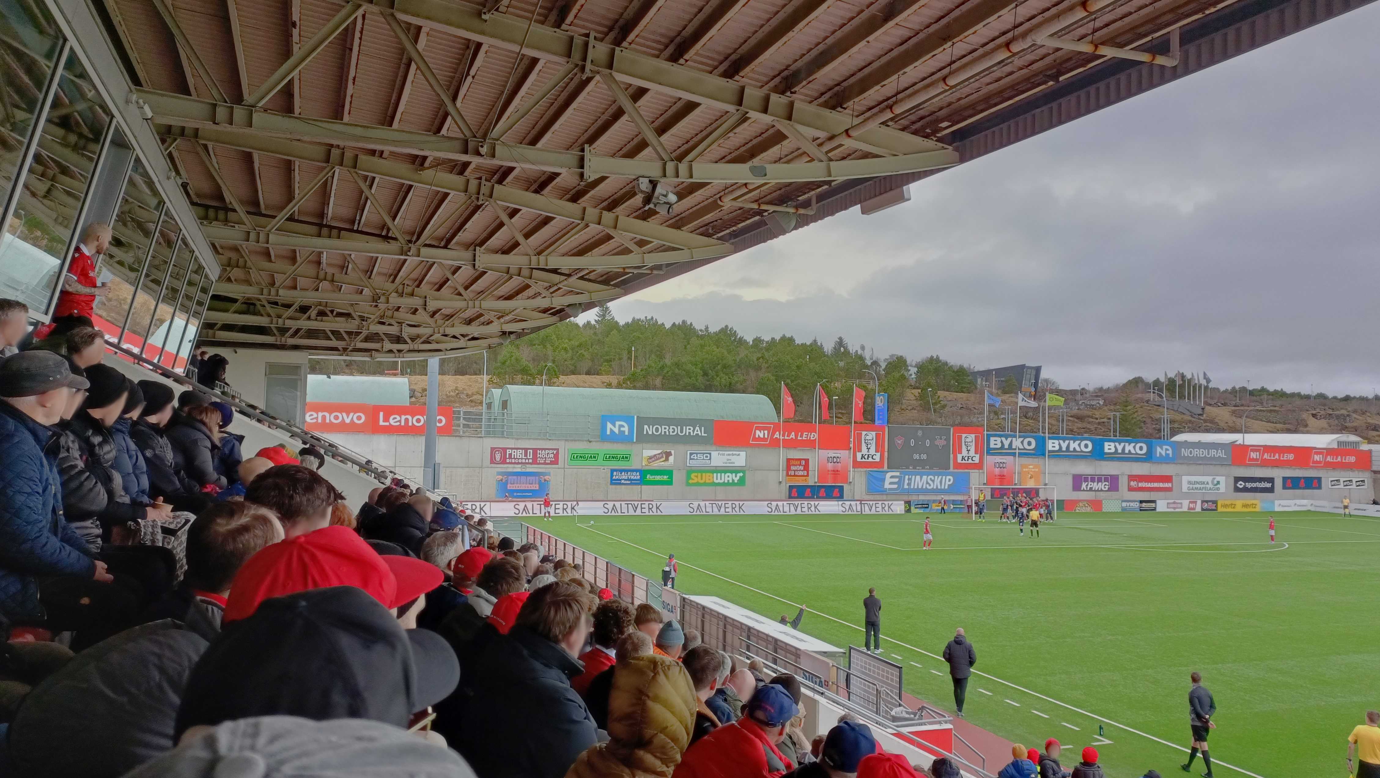 |  | | Druga połowa - piłkarze gości (oraz grupka kibiców na trybunie) świętują gola na 1:0 | |