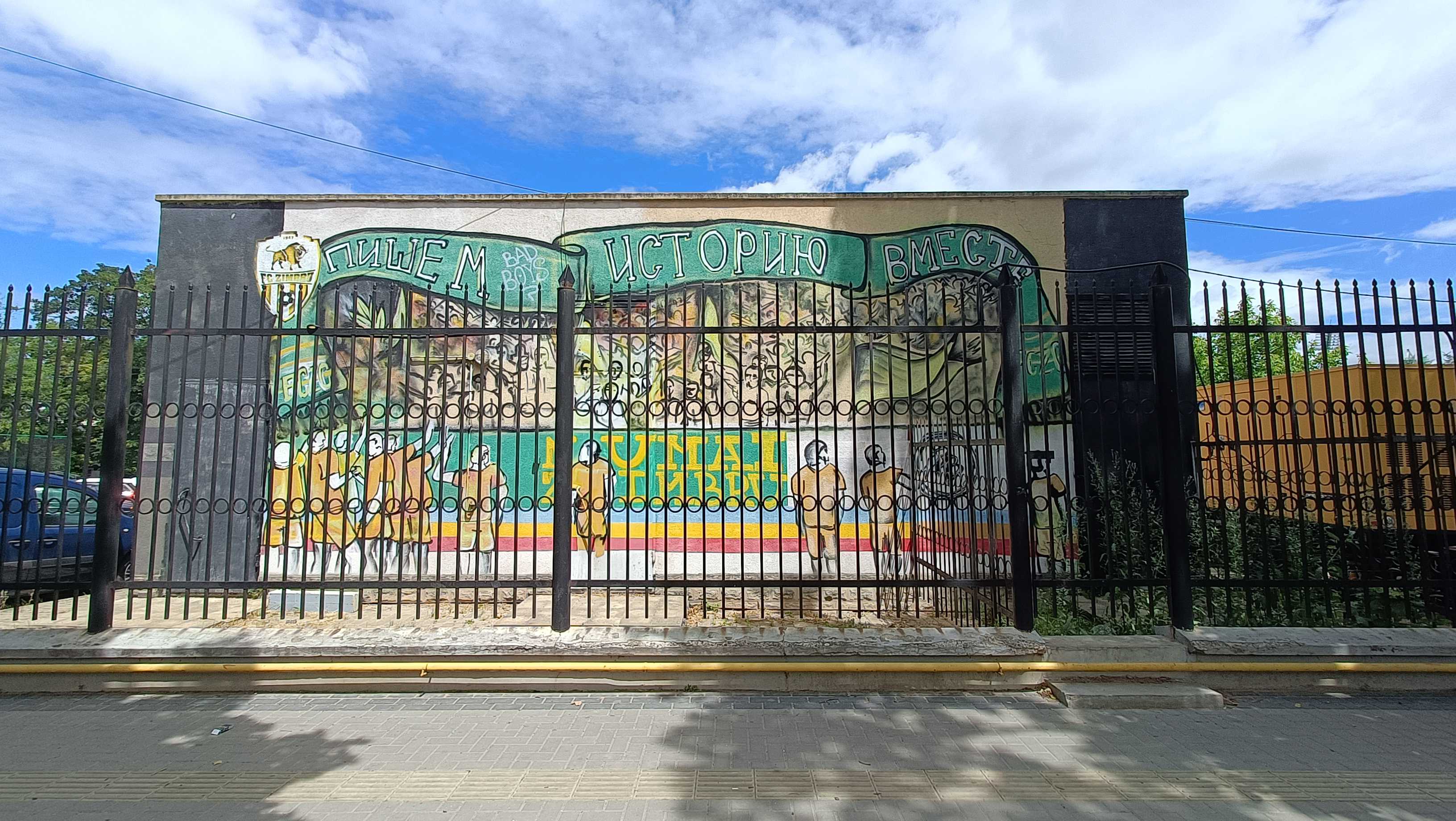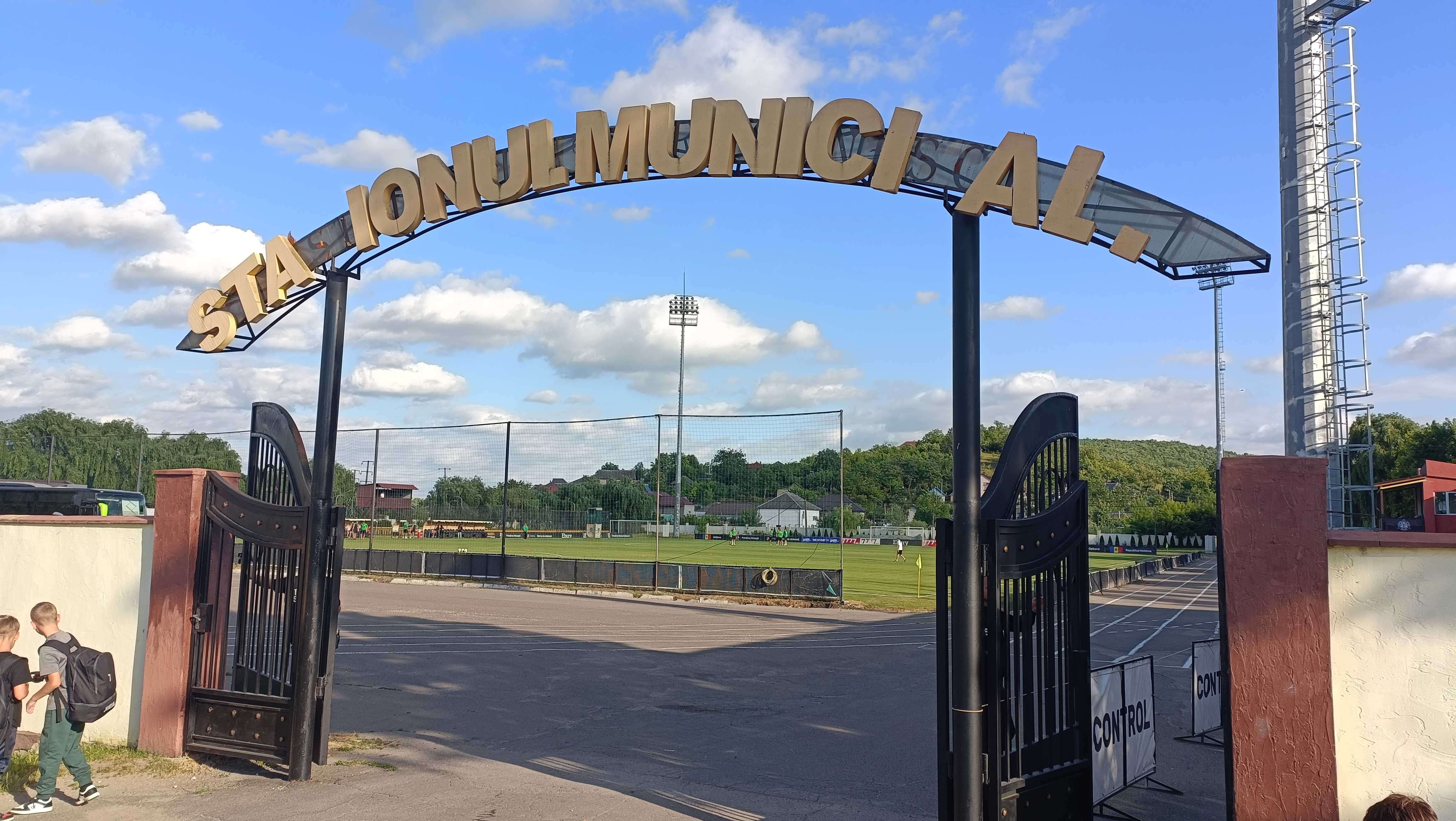 |  | | Główne wejście na Stadionul Zimbru, a w tle legendarne blocuri | |