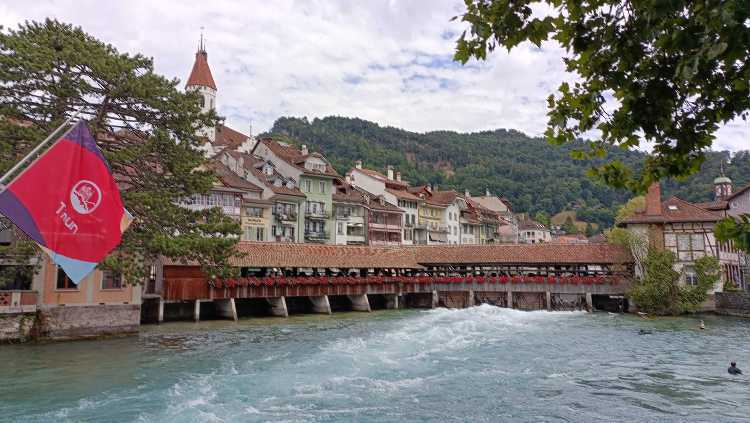 |  | | Mostek w Thun (gdzieś tam w spiętrzonej wodzie rzeki Aare pływają surferzy) | |
