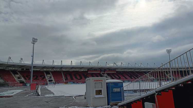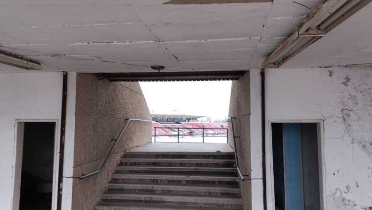 |  | | Zdjęcie stadionu zrobione znad betonowego ogrodzenia | |