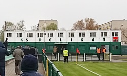 Łowicz jest piłkarskim miastem. W Internetach znalazłem informację, że parę tygodni wcześniej na meczu Widzew-Pelikan na stadionie pojawiło się prawie 700 fanów z Łowicza... z czego przeważająca większość w barwach czerwono-biało-czerwonych. Na domowym meczu Pelikana z Lechią TM stawiło się ok. 300-350 osób, ale skład osobowy chyba znacznie różnił się od tamtej grupy wyjazdowej, ponieważ intensywność dopingu była adekwatna do pory rozgrywania spotkania (niedziela, 11:15). Trybuny ograniczały się do spontanicznego pokrzykiwania na piłkarzy i głośnego komentowania pracy sędziego (Zdrów jak koń! padło z trybun, kiedy po jednym z fauli podniósł się z boiska Kamil Szymczak). W zasadzie na trybunach nie działo się nic ciekawego, poza sporadycznymi zrywami w drugiej połowie, kiedy zgromadzeni widzowie zaczynali krzyczeć Pelikan! Pelikan! . Wodzirejem w takich sytuacjach był pewien emeryt, który z władczością pokazywał rękami poszczególnym sektorom kto ma jak śpiewać, co wyglądało trochę zabawnie. Ale gdyby nie on, elementy dopingu na trybunach chyba zanikłyby całkowicie.