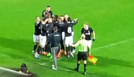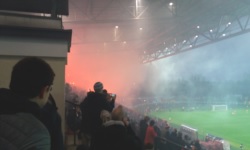 Na samym początku drugiej połowy flagowisko pojawiło się na sektorze gości - goście zaczęli wymachiwać czerwonymi i białymi flagami, co z kolei dało na trybunie wzór czerwono-biało-czerwony. Gdyby zaś ktoś miał problemy z rozróżnianiem kolorów (lub np. stwierdził, że wzór jest biało-czerwono-biały ), na płocie rozwinięty został transparent ROSSO-BIANCO-ROSSI. Odwróciło to trochę uwagę od sektora Polonii, gdzie ok. 60. minuty rozwinięto jednak transparent opętani czarną magią , a na trybunie rozciągnięto flagę przedstawiającą kogoś w rodzaju czarnoksiężnika, który okrywał dłonią trochę niezbyt wyraźnie przedstawiony herb Czarnych Koszul. I w końcu pojawiły się też race. Ok. 75. minuty na płocie Kamiennej pojawił się z kolei transparent o treści BO TO JEST STARA SZKOŁA OSTREGO JARANIA , po czym na trybunie pojawiło się jeszcze więcej rac. I jeszcze raz flagi (cięzko już za tym wszystkim nadążyć) Swoją drogą, tuż przed tą oprawą miał miejsce pewien kiks, ponieważ mniejsza sektorówka, pod którą zapewne czyniono niezbędne do powstania oprawy czynności, została rozwinięta w pośpiechu na lewą stronę. Po zremisowanym meczu kibice Polonii podziękowali graczom za walkę, podczas gdy kibice Widzewa byli nieco rozczarowani (nie wiem, czy piłkarze nie usłyszeli czegoś w stylu Widzew grać... .