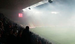 W trakcie meczu kibice obydwu drużyn śpiewali głównie niezbyt skomplikowane rzeczy, ale ja i tak nie ogarnąłem, o czym była większość piosenek – na pewno Slavia śpiewała dość często „Slavie do toho” (czasem też coś, co brzmiało mniej więcej jak „My chcemy gol”). Jeśli chodzi o wydarzenia kibicowskie, mecz zdecydowanie zdominowali jednak goście. Baník gdzieś w okolicach 20. minuty zaprezentował pierwszą oprawę w tym meczu – z sektorówką i kartoniadą. Następnie, po wykonaniu niezbędnych czynności pod sektorówką, dopełniono dzieła pirotechniką. Przy okazji na płocie Baníka zapłonęła jedna flaga Slavii – tyle że taka z rodzaju tych „kieszonkowych”, nie jakaś konkretna. Wszystko wyglądało bardzo fajnie, ale w pewnym momencie race zaczęły latać – na boisko, na bufor, w pikników, w ochroniarzy (jednego nawet poparzyło). Następnie Baník próbował wydostać się z klatki, co wywołało pewne poruszenie na pikniku (z drugiej strony, fani Slavii z trybuny Sever ponoć kręcili się przy buforze i również dążyli do konfrontacji), a wszystko zakończył wjazd policji na sektor gosci i gazowanie. Obydwie trybuny – gości i gospodarzy, zaśpiewały wtedy zgodnie coś, co tym razem zrozumiałem (szczególnie, że leciało to tak samo jak w Polsce): „Český fotbal pro fanoušky” Nie mam nic przeciwko pirotechnice, a przerywanie meczów z powodu zadymienia stadionu jak dla mnie są ciekawym elementem folklorystycznym, który można by wpisać na listę światowego dziedzictwa UNESCO – po oprawie Baníka sędzia przerwał mecz na jakieś 5-6 minut. Co do rzucania racami na boisko, w ochronę, czy w piknik (a od początku meczu rzucano na boisko petardami hukowymi)… to już bynajmniej nie ubogaca kultury.