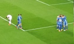 W drugiej połowie Baník zaprezentował jeszcze jedną oprawę, na którą złożyło się mnóstwo niebieskich i białych podłużnych nadmuchiwanych elementów, których nie potrafię nazwać. Przy ich pomocy zrobiono coś w rodzaju kartoniady i odpalono pozostałą pirotechnikę, co tym razem nie doprowadziło do przerwania meczu ani żadnych tego typu przypałów. Slavia z kolei wykonała flagowisko. W 73. minucie (nie wiem czemu, ale zanotowałem sobie, która to była minuta), Baník zaśpiewał również coś, co brzmiało prawie że dokładnie jak polskie „Pozdrowienia do więzienia”.