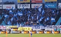 Piknik nie angażował się chyba w ogóle w doping, nawet wtedy gdy padały bramki dla gospodarzy. Akustyka obiektu sprawiała, że przyśpiewki młynu nie były podłapywane przez piknik. Młyn gości liczył na moje niewprawne oko liczył ok. 500-600 osób. Przed meczem zawiesili na ogrodzeniu kilka flag (częściowo zasłoniętych reklamami LVBet) z hasłami Wisła Płock , Płock , Petrochemia , zgodowa Stomil , Nadwiślańscy… (nie dojrzałem kto) i parę drobiazgów. Jeszcze przed pierwszym gwizdkiem dwie z nich zostały przykryte przez transparent nawiązujący do aktualnych wydarzeń politycznych – długie płótno z napisem GERMAN DEATH CAMPS w kolorach narodowych sąsiadów zza Odry. Wisiało tam przez cały mecz, więc jak dla mnie nie musiało ono koniecznie przykrywać flag – mogło wisieć na peryferiach trybuny, a realizator i tak uchwyciłby je wystarczająco wiele razy. To, co jest dość ciekawe we flagach Wisły Płock (i co jest charakterystyczne chyba dla wszystkich gadżetów kolportowanych przez kibiców), to fakt, że na żadnym z nich nie znajduje się aktualny herb Wisły. Nafciarze używają tutaj wyłącznie starych herbów ZKS Wisła Płock oraz Petrochemii Płock. I rzeczywiście, te herby są znakomite – można powiedzieć, że kibice używają herbu, a klub używa logo. To przywiązanie do oldschoola to chyba pozostałość z czasów, kiedy miał miejsce rebranding marki Petrochemia, a klub z Płocka przez parę lat używał fatalnych nazw (Orlen , Petro ,Mychajło ) i jeszcze gorszych logotypów.