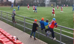 Ze względu na to, że boisko boczne to tylko boisko boczne i na terenie obiektu nie ma klatki gości, tym razem nie miałem okazji zobaczyć fanów ŁKS-u, co mnie bardzo rozczarowało. Jest to bowiem dobra (szczególnie jak na trzecioligowe standardy) ekipa wyjazdowa, która wykręca przyzwoite liczby (po kilkadziesiąt osób). Oczywiście w związku z przeniesieniem meczu na orlik rezerwowy obiekt, Policja nie zezwoliła na przyjazd zorganizowanej grupy gości. Być może ktoś z Łomży nawet pojawił się na meczu incognito, ale było to naprawdę incognito, ponieważ nie słyszałem żadnych oznak radości w momencie gdy ŁKS wyszedł na prowadzenie.Pomimo niezbyt sprzyjającej pogody (zima jeszcze nie do końca w odwrocie) i niezbyt komfortowych warunków na obiekcie, na meczu zjawiło się ponad 200 osób. Nie przełożyło się to na wielkie atrakcje kibicowskie. Całą atmosferę robiło 3-4 stojących nieopodal mnie gości, którzy raz na jakiś czas wznosili różne okrzyki (pomiędzy okrzykami rozprawiali między sobą, próbując odtworzyć wydarzenia ze wspólnie spędzonego wczorajszego wieczora - taka niskobudżetowa wersja Kac Vegas). Jeden z nich miał na tyle donośny głos, że czasami nawet porywał pikników w promieniu kilku metrów, w tym mnie. Najczęściej wykrzykiwanym hasłem było Kto najlepiej w piłkę gra - KS Ursus Warszawa! , ale były też ciekawsze rzeczy, takie jak Traktorki, Traktorki, Traktorki to My! (w rytmie Kalinki ), Jesteśmy u siebie! (?), czy wreszcie mój faworyt (prawie za każdym razem cenzurowany ze względu na obecność dzieci):Czy słońce, czy deszcz - Ursus RKS!A jak spadnie grad, rozjebiemy świat,tylko Ursus RKS!