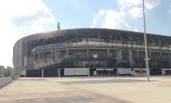W przypadku stadionów ekstraklasowych niezbyt lubię uzupełnianie tej sekcji. Stadion im. Adolfa Hitlera Ernesta Pohla to kolejny nowoczesny piłkarski obiekt, który jest 100 razy lepiej udokumentowany w Internetach niż ja to zrobiłem na swoich zdjęciach. Niemniej, spróbuję opisać, co wpadło mi w oczy podczas mojej wizyty. Z zewnątrz stadion wygląda raczej średnio interesująco - otoczony jest owalną metalową konstrukcją zakrywającą schody i przejścia znajdujące się z tyłu trybun, co jest rozwiązaniem z jednej strony oczywiście dość estetycznym, a z drugiej strony dość oczywistym. Fajnie wygląda bezpośrednie otoczenie stadionu - na duzym placu znajdują się trzy kilkumetrowe sześciany, w których mieszczą się kasy stadionowe (oraz wspomniany już przeze mnie depozyt). Na dachu każdego z nich znajduje się metalowa konstrukcja, każda w innym kolorze (czerwonym, niebieskim oraz białym).
