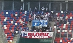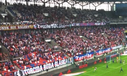 Pozdrowiono zgody - Wisłokę Dębica, GieKSę Katowice, Hajduka Split, oraz ROW Rybnik (przyznam szczerze, zastanawia mnie trochę ten klub - specyficzny akronim w nazwie, specyficzny herb... muszę kiedyś zaplanować wycieczkę do Rybnika). A po drugiej stronie stadionu? Goście ze względu na typowe dla wyjazdowiczów problemy natury logistycznej zaczęli się pojawiać na swoim sektorze w okolicach pierwszego gwizdka. W sumie było ich kilkudziesięciu; przywieźli ze sobą biało-czerwoną flagę PŁOCK z klasycznym, oldschoolowym herbem ZKS-u, oraz dwie mniejsze biało-niebieskie flagi, których treści nie udało mi się rozszyfrować. Na jednej znajdował się również herb ZKS-u, na drugiej litera P . Prowadzili oni oczywiście doping, jednak ze względu na moje ulokowanie na trybunie, nie mogłem wychwycić żadnych słów, bo wszystko tłumił doping Torcidy. Dosłyszałem Jesteśmy zawsze tam... , czy PZPN, PZPN... (w pierwszej połowie miała miejsce ręka Górnika w polu karnym, sędzia jednak nie zareagował; raczej słusznie), ale bardziej ze względu na charakterystyczną melodię.