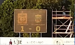 W skład Olimpiskais centrs Ventspils wchodzi m.in. stadion piłkarski, hala do grania w kosza oraz, o ile dobrze zrozumiałem, hala do hokeja na lodzie. Stadion piłkarski to jedna zadaszona trybuna położona wzdłuż linii bocznej boiska, mogąca pomieścić 3200 widzów. Miejsca są dość wygodne i z racji tego, że trybuna jest podwyższona o parę metrów względem poziomu boiska, całkiem dobrze widać z niej wydarzenia boiskowe - i to pomimo obowiązkowej bieżni (cóż, bieżnia musiała być, w końcu całe centrum jest olimpijskie ). Cała trybuna jest zadaszona. Za najwyższymi rzędami znajdują się przeszklone stanowiska, które być może są stanowiskami dla mediów, lub też lożami VIP. Naprzeciwko trybuny, po drugiej stronie boiska, znajduje się tablica wyników, która pozwala na wyświetlanie takich rzeczy jak herby drużyn, ale jest dość ciemna i w mocnym słońcu prawie w ogóle nie było na niej widać przedstawianych treści.