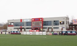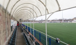 Na stadionie znajduje się... kilka trybun - to jest adekwatne określenie. Przede wszystkim, wzdłuż linii bocznej ciągnie się trybuna główna, która składa się z zaledwie trzech rzędów krzesełek. Cała trybuna jest zadaszona niskim dachem i liczy około 450-500 miejsc siedzących. Trybuna jest co prawda niska, ale znajduje się dosłownie tuż przy boisku. Na plus oceniam fakt, że w życiu nie siedziałem tak blisko linii bocznej. Z kolei na minus fakt, że idąc chodnikiem wzdłuż trybuny niewygodnie jest mijać się z osobą idącą z naprzeciwka, tak jest wąsko. Obok trybuny znajduje się punkt gastronomiczny, gdzie można kupić giętą z grilla, herbatę i być może jakieś inne produkty, ale nie zgłębiałem dokładnie tej kwestii.