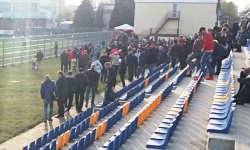 Poza tym, sama trybuna jest przyzwoita i estetyczna; niebieskie i żółte krzesełka składają się w napis UNIA i są całkiem wygodne, z wysokimi oparciami. Na wschodnim skraju trybuny znajduje się ogrodzony (jakby mało było ogrodzeń) sektor gości, co przy okazji oznacza, że gospodarze i goście zasiadają tak naprawdę na tej samej trybunie. Pomiędzy nimi jest jeden sektor buforowy, na którym jest sam beton, bez krzesełek. Na zdjęciu satelitarnym w Internecie chyba widać tam jeszcze krzesełka, ale w realu są one już odkręcone i pozostały po nich tylko jasne ślady na posadzce, niczym w kreskówkach.