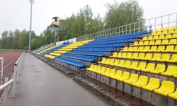 Kėdainių miesto stadionas jest częścią kompleksu sportowego, w którego skład wchodzi jeszcze hala sportowa. Hala służy lokalnym koszykarzom, którzy grają chyba w koszykarskim odpowiedniku Ligi Europy, ale jako Chomik Piłkarski oczywiście skupię się na stadionie. Stadion zgodnie z oficjalnymi danymi liczy 3000 miejsc siedzących (ha! czyli więcej niż hala! Litwini jednak wiedzą, co dobre...), znajdujących się na dwóch odkrytych trybunach położonych wzdłuż linii bocznej. Od strony zachodniej znajduje się trybuna o ośmiu rzędach żółtych i niebieskich krzesełek. Za trybuną znajduje się nasyp kolejowy i raz na jakiś czas przejeżdża tamtędy jakiś pociąg. Zazwyczaj towarowy, ale pod koniec meczu być może przejeżdżał ten odjeżdżający z Wilna o 14:15. W centrum trybuny, na wysokiej konstrukcji znajduje się blaszana budka dla spikera/kamerzysty.