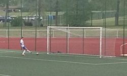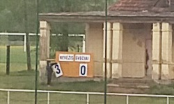 Barwami klubowymi zarówno gospodarzy jak i gości z Kretyngi jest kolor niebieski. W trakcie rozgrzewki piłkarze obydwu drużyn mieli na sobie czarne bluzy i niebieskie spodenki - kiedy drużyny zeszły przed meczem do szatni i wróciły we właściwych strojach meczowych, okazało się na szczęście, że jedni mieli na sobie niebieskie, a drudzy białe trykoty. Pozostało mi już tylko ustalić, którzy to Nevėžis, a którzy to Minija. Lepiej grali ci w białych koszulkach, ale reakcje kibiców na trybunach były dość stonowane i nie do końca byłem pewien, czy to na pewno gospodarze. A biali od początku wyprowadzali całkiem konkretne akcje - w 6. minucie Gėgžna próbował strzału w okienko, ale kąt był na tyle ostry, że bramkarz raczej musiał to odbić. W 17. minucie strzał z woleja Kugysa został zblokowany przez obrońców w niebieskich trykotach. W 28. minucie miało miejsce duże nieporozumienie pomiędzy stoperami niebiesko-niebieskich, w wyniku którego Inta zgrał piłkę głową do napastnika biało-niebieskich. Kugys wbiegł z piłką w pole karne i w sytuacji sam na sam pokonał Kazbarisa. Kibice poderwali się z miejsc, a jeden z dzieciaków ruszył w kierunku tablicy i zmienił wynik na 1:0.