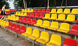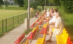 Obiekt Zwierzynieckiego KS-u stosunkowo niedawno został poddany renowacji. W jej wyniku wymieniono m.in. stare ławki na trybunie na krzesełka z oparciami. Cieszy fakt, że przy okazji nie zmieniono murawy z naturalnej na sztuczną; z kolei szkoda, że zdemontowano przy okazji oldschoolową bramę z napisem Zwierzyniecki Klub Sportowy i sylwetką lajkonika, którą widziałem na internetowych zdjęciach. Trybuna jest jedna, położona wzdłuż linii bocznej boiska - składa się ona z czterech rzędów żółtych i czerwonych krzesełek. Niestety, trybuna skierowana jest w stronę zachodnią, przez co nadzisiejszym meczu (temperatura odczuwalna 45'C , jak straszyła mnie siostra) spaliłem sobie twarz.