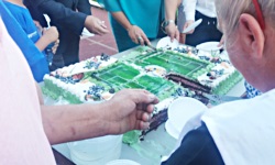 W przerwie meczu miała zaś miejsce owa słodka niespodzianka , którą organizatorzy obiecali na plakacie zapraszającym na mecz. Na bieżnię wyjechał tort w kształcie boiska piłkarskiego naturalnej wielkości, a spiker zaprosił wszystkich widzów z trybuny na poczęstunek. Po chwili spora część widzów zeszła z trybuny na bieżnię i zaczęła formować dość nieskładną kolejkę, w której też się ustawiłem (jeszcze mi się nie zdarzyło, żebym jadł na meczu tort). Tort był bardzo dobry, a jego ilość była w zupełności wystarczająca - jeszcze po meczu można było się załapać na dokładkę.