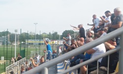 Na trybunie głównej zasiadł cały przekrój świdnickiego społeczeństwa, czyli rodzice z dziećmi, młodzież i ludzie w wieku okołoemerytalnym. Ku naszemu zdziwieniu, na znajdującej się naprzeciwko trybunie zwykle wyłączonej z użytku również zasiadało kilka osób. Nawet ku naszemu podwójnemu zdziwieniu, ponieważ w samo południe słońce promieniowało okrutnie i tamta trybuna była ostatnim miejscem, na którym chcielibyśmy się wtedy znaleźć. Nie byli to również goście (swoją drogą, klatka gości była tego dnia pusta), ponieważ z tego co mi się wydaje, któraś z tych osób miała na sobie żółto-niebieskie barwy. Cóż, zagadka pozostanie chyba nierozwiązana już na zawsze.
