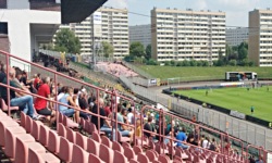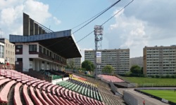 OK, żeby trochę poukładać ten opis - stadion składa się z jednej trybuny, która liczy jakieś 5,5 tysiąca krzesełek; jej krańce są wyłączone z użytku, a siedziska na nich są zdemontowane. Główna część trybuny pokryta jest krzesełkami koloru zielonego, czarnego i żółtego. Na szczycie trybuny znajduje się zadaszona konstrukcja, na której piętrze znajduje się pewnie coś w stylu stanowisk dla VIP-ów, ale tutaj trochę strzelam. Dach owej konstrukcji obejmuje swoim zasięgiem górne sektory trybuny, które są oddzielone od plebsu specyficznymi murkami - jeden z takich górnych sektorów zaanektowali fani i obecnie znajduje się w nim Młyn (jest to dość nietypowe położenie, ponieważ oznacza to, że młyn znajduje się za piknikiem). Na skraju łuku trybuny znajduje się dość pojemny sektor gości - co ciekawe, wcale nie tak daleko od młynu (są od siebie wzajemnie oddzielone jednym pustym sektorem buforowym). Dookoła stadionu stoją cztery maszty oświetleniowe (podczas drugiej połowy oglądałem mecz na stojąco, w cieniu jednego z nich), a od zachodniej strony boiska znajduje się budynek klubowy (przypominający trochę szkolną halę sportową) z dużym kolorowym telebimem na dachu, na którym wyświetlane są wyniki i inne tego typu informacje.