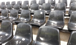 Stadion w Jastrzębiu-Zdroju to obiekt starszego typu - boisko jest otoczone szeroką bieżnią (nie wiem czemu, wyasfaltowaną), a dookoła niej znajduje się wysoki ziemny wał - jego połowa znajdująca się od północnej strony boiska przeznaczona jest na trybunę. Jako osobie źle znoszącej słońce (poparzenia słoneczne, udary słoneczne i takie tam) nie przypadł mi do gustu fakt, że trybuny są skierowane na południe, szczególnie, że tego dnia było bezchmurne niebo i jakieś 28'C pogoda też nie sprzyjała grze w piłkę. A położony pośrodku trybuny sektor to była już totalna patelnia, ponieważ wszystkie ustawione na nim krzesełka były w kolorze doskonałej czerni (nie jakiś wyblakły szajs, tylko właśnie doskonała czerń, albedo 1%).