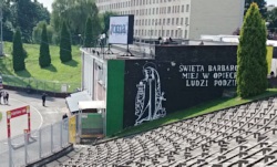 Po bocznej stronie wspomnianego budynku znajduje się graffiti przedstawiające św. Barbarę i hasło Święta Barbaro, miej w opiece Ludzi Podziemia . Religijnych akcentów w trakcie mojego wypadu do Jastrzębia zaobserwowałem więcej, np. w sklepie klubowym wisiał całkiem duży wizerunek Jana Pawła II (i to bez podpisu w stylu gdy w nocy poluzowałeś somsiadowi śruby w kołach... ).