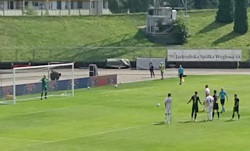 Parę minut później miała miejsce ciekawa sytuacja - otóż Resovia przeprowadziła akcję, która skończyła się wybiciem przez Mateusza Słodowego piłki na rzut rożny. Nie wykonali go jednak, ponieważ rozpoczęło się coś, co mógłbym nazwać misterium - sędzia wstrzymał grę i udał się na drugi koniec boiska do stanowiska VAR. Posiedział tam parę minut, a następnie wrócił pod pole karne Jastrzębian i wskazał na wapno. Nikt nie miał pojęcia, dlaczego właściwie to zrobił, w każdym razie Marek Mróz pewnym strzałem z jedenastu metrów pokonał Mikołaja Reclafa. Dopiero po meczu wyczytałem , że w rzeczywistości Słodowy podczas swojej interwencji wślizgiem odbił piłkę na rzut rożny właściwie ręką - karny oczywiście był słuszny, ale z perspektywy trybuny wyglądało to dość absurdalnie.