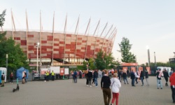 Z racji tego, że siedziba mojej firmy jest w Warszawie, mój dojazd na mecz Reprezentacji polegał na tym, że przed godziną 19 wyszedłem z pracy, wsiadłem w metro, a potem przesiadłem się na pociąg KM relacji Warszawa Zachodnia - Siedlce, wysiadając na stacji Warszawa Stadion. Na trasie pomiędzy stacją a Narodowym porozstawiane były różne (legalne i nielegalne, bo przy niektórych stała Straż Miejska) kramy z gadżetami dla kibiców oraz foodtrucki i grille. Na stoisku z gadżetami zakupiłem sobie obowiązkowy szalik; z gastronomii nie skorzystałem, ale jeśli ktoś planuje coś jeść na stadionie, raczej rekomenduję zmienić te plany i rzeczywiście skorzystać z tych foodtrucków - nawet jeśli jedzenie jest w cenie typowego jedzenia z foodtrucków. Po przejściu przez kontrolę biletową i kontrolę osobistą plecaka, dostałem się w bezpośrednie otoczenie stadionu. Zrobiłem sobie spacer dookoła stadionu, podziwiając jego biało-czerwoną szaro-bordową kolorystykę (przy okazji, wiedzieliście, że Pałac Kultury i Nauki był oryginalnie koloru kremowego, a swój obecny kolor zawdzięcza temu, że przez dziesiątki lat wciągał on syf z warszawskiego powietrza niczym hadżar?), a następnie przeszedłem przez bramkę biletową.
