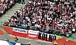 Zwykle w tej sekcji opowiadam o zaobserowanych na meczu flagach (jakieś PDW, czy inne Hool's, zgodnie z archaiczną ortografią). Tym razem flagi oczywiście były inne - biało-czerwone z napisami miejscowości. Nie było ich tak znowu dużo, jak się spodziewałem (w ogóle, samych kibiców nie było dużo, bo nieco ponad 37 tys.), ale zaobserwowałem najważniejszy amulet - słynną (tak mi się wydaje) flagę FOTO-HIGIENA .