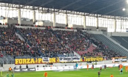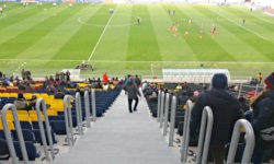 Biorąc pod uwagę, że zacząłem odjeżdżać już od tematu (sekcja ta nazywa się bowiem po prostu Stadion ), wróćmy do pisania o samym stadionie - docelowo będzie on zgrabnym, czarnym pudełeczkiem, oczywiście w pełni zadaszonym (taka nieco lepsza Arena Lublin). Trybuny (te, na których krzesełka już są zainstalowane) mają kolorystykę granatowo-bordową, a na trybunie południowej krzesełka w złotym kolorze tworzą napis POGOŃ 1948 . Na stadionie znajdują się 2 telebimy (jest to chyba już liczba docelowa), na których wyświetlane są różne profesjonalne treści mutlimedialne, a w trakcie meczu oczywiście przede wszystkim aktualny wynik. Spośród prezentowanych na ekranach reklam najbardziej zaintrygowała mnie reklama Paprykarza Pogoni Szczecin, którego niestety nie można było kupić na stadionie ze względów bezpieczeństwa... ani poza nim, ponieważ w niedzielę wszystkie sklepy, które normalnie ten produkt oferują, były zamknięte.