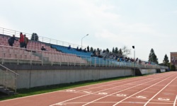 Konsekwencją istnienia dwóch stref biletowych - tej za 10 PLN i za 8 PLN, jest fakt, że na stadionie istnieją dwa różne wejścia i dwa różne punkty sprzedaży biletów, co jest dość dużą ciekawostką jak na piąty poziom rozgrywkowy. Poza tym, nie zdążyłem scharakteryzować paru innych podstawowych elementów stadionu - otóż znajduje się na nim bieżnia, co trochę utrudnia odbiór meczu (ale przynajmniej można po niej łazić), a także tablica wyników. Na tablicy nadrukowane są napisy GOSPODARZE i GOŚCIE i można na niej wyświetlić jedynie czas i wynik, ale tak samo jest zresztą na Avii, więc chyba nie mam powodu, żeby narzekać.