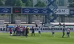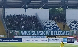Na meczu pojawili się również kibice gości - jak to na polskich stadionach bywa, pokazali się w swoim sektorze dopiero pod koniec pierwszej połowy, wcześniej bowiem trwała standardowa skrupulatna kontrola, a wszystkiemu towarzyszył szpaler policjantów w białych kaskach. Bezpieczeństwo jest bowiem najważniejsze i takie tam. W końcu kibiców wpuszczono do ogrodzonego sektora gości, który... nie był zamknięty, dlatego część fanów Śląska stanęła w sektorze buforowym, żeby zobaczyć mecz z lepszej perspektywy niż zza dwumetrowego ogrodzenia (i znów - organizacyjnie: Stal Mielec ). Oczywiście, kibice na strefie buforowej nie stanowili dla pikniku żadnego zagrożenia, ale pierwszy raz widzę taką fuszerkę - dopiero po kilku minutach ochrona pokierowała wszystkich kibiców do swojego sektora.