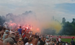 W poprzednich sekcjach przypadkowo zdążyłem wspomnieć o istotnych elementach klimatu dzisiejszego meczu - że przed stadionem były rozdawane prawdziwe fizyczne wejściówki na mecz, a na stadionie byli kibice gości. Co do kibiców gości, na początku przechadzali się oni po trybunie głównej w swoich barwach (koszulki, szaliki, itp.) i wbrew pozorom, byli przyjmowani oni dość życzliwie. Koniec końców, zebrali się oni na nieoddanym jeszcze do użytku sektorze gości, ale gdyby pozostali na trybunie gospodarzy, do niczego zdrożnego by nie doszło. Na trybunach była też niezłomna Pani Grażyna, która co prawda siedziała w zupełnie innym sektorze niż ja, ale i tak bardzo dobrze ją było słychać, gdy wykrzykiwała raz po raz Brawooo! podczas wyczytywania składów przez spikera.