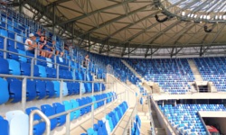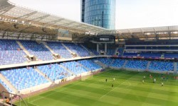 Swoją drogą, Štadión Tehelné pole to rzeczywiście bardzo ciekawy kawałek architektury, ponieważ jest on bardzo dobrze wtopiony w tło i z zewnątrz tak naprawdę nie za bardzo widać, że w tym punkcie Bratislavy znajduje się najważniejszy stadion piłkarski na Słowacji. Od strony ulicy widać przede wszystkim kilka mieszkalnych wieżowców, za którymi znajduje się właściwy stadion. Majstersztykiem jest na pewno zrośnięty ze stadionem przeszklony wieżowiec Tower 5, w którym zapewne znajdują się jakieś biura dla korpo-ludzi. Stadion liczy 22.500 miejsc siedzących (w zasadzie trochę mało jak na piłkarski stadion narodowy), a krzesełka są utrzymane w niebieskiej kolorystyce. Widoczność z poszczególnych miejsc na trybunie jest bardzo dobra, a dwa duże telebimy wiszące nad trybunami zabramkowymi dodatkowo poprawiają odbiór meczu. Generalnie, bardzo dobry, porządny stadion na poziomie europejskim.