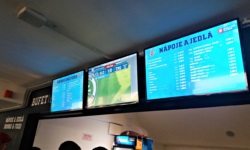 We wnętrzu trybuny znajdują się stoiska gastronomiczne, a nad każdym z nich znajduje się zaś ekran, na którym można oglądać wydarzenia boiskowe - aby ktoś, kto zdecydował się w trakcie rozgrywki nasycić jakimś Radegastem, nie stracił ani jednej chwili z bezcennej rozgrywki. W przerwie meczu zakupiliśmy sobie napoje, a ja postanowiłem również kupić dla każdego z nas po jednym pagáču, czyli... sam właściwie nie wiem co. Spodziewałem się czegoś tak dobrego jak kibinas (litewska drożdżówka z mięskiem), a w rzeczywistości było to coś, co przypominało kulistego croissanta, takiego trochę słonego, trochę suchego i bez nadzienia.