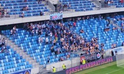 Z naszych miejsc mieliśmy dobry widok na C-sektor (trybuna południowa zabramkowa), gdzie zasiadają ultrasi Slovana. Wywiesili oni następujące flagi: Ultras Pezinok 1919 , Belasi Patrioti , Malokarpatská Divizia , Slovan Hooligans Pressburg (niemiecka nazwa Bratislavy, z którą Słowacy też się do pewnego stopnia utożsamiają - w każdym razie, na pewno bardziej niż z węgierskim wariantem Pozsony ), Zverina i parę innych. Przy okazji, przed meczem na murawie pojawiły się dzieciaki niosące flagi z herbami Slovana - również tymi z czasów ČSSR, kiedy w logotypie znajdowały się czerwone gwiazdy i inne znaki tamtych czasów (to chyba m.in. z tego powodu obecny herb Slovana ma kształt pięciokąta).