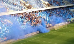 Poza tym, było śpiewane m.in. Sialalalala, Belasi, gol! (Belasi to przydomek Slovana), Slovan, do toho! (czyli tak samo jak po czesku), a w drugiej połowie doszło także do pozdrowień dla Ferencvarosa (a mianowicie, padły wspomniane już wcześniej w relacji maďarské kurvy ). W drugiej połowie kibice w młynie odpalili też świece dymne, co spowodowało, że cały štadión na Tehelnom poli spowił niebiesko-biały dym.