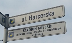 Samo B³onie (wbrew temu, co niektórzy uwa¿aj¹, jest to l. poj., rodzaj nijaki - przyp. chom.) to spokojne miasto licz¹ce ok. 12 tys. mieszkañców. W drodze na stadion szed³em przez osiedla domków jednorodzinnych, ogl¹daj¹c porozmieszczane tu i ówdzie grafy Legii. Na jakieœ 40 minut przed pierwszym gwizdkiem otworzono kasê biletow¹, gdzie uiœci³em op³atê 15 z³ i otrzyma³em bilet. Przy bramce wejœciowej prowadz¹cej na trybunê znajdowa³ siê kibic zbieraj¹cy do puszki na oprawê, a ja wrzuci³em pi¹taka, którego otrzyma³em w kasie jako resztê z 2 dych - nie wszyscy byli tak hojni, poniewa¿ wchodz¹cy przede mn¹ na obiekt emeryt powiedzia³ jedynie nic wam nie dam, bo za bardzo bluŸnicie .