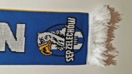 A, właśnie, przed meczem zaszedłem do budynku klubowego i kupiłem sobie szalik uiściłem darowiznę na cele statutowe klubu, a w ramach wdzięczności otrzymałem szalik. Ten szalik to jedna z najlepszych pamiątek, jakie udało mi się dorwać w tym roku. Już podniecałem się samą nazwą klubu, ale należy jeszcze dodać, że herb klubu również jest fajny (chciałoby się rzec - nareszcie, bo jeszcze kilka lat temu emblemat klubowy pozostawiał wiele do życzenia), a na szaliku prezentuje się on wprost znakomicie. W ogóle, cały szalik jest bardzo wysokiej jakości, a na jego odwrocie są nawet wydziergane najbardziej charakterystyczne miejsca Żelechowa.
