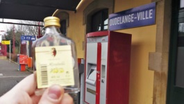 W niedzielę natomiast nadszedł czas na główny punkt wycieczki, jakim była pielgrzymka do Kolebki Futbolu. O godzinie 9:39 wsiadłem na Gare Centrale w pociąg relacji Luxembourg - Nancy i wysiadłem o godzinie 9:50 w niezbyt znanej miejscowości Beetebuerg (Bettembourg), gdzie miałem przesiadkę. Z racji tego, że do meczu w Diddeleng było jeszcze dość długo, spędziłem najpierw godzinę na zwiedzaniu owego Beetebuergu. Prawdę mówiąc, nie było tu za dużo do oglądania - najciekawszym punktem był chyba położony na obrzeżach miasta stadion lokalnego klubu SC Bettembourg, gdzie tego dnia o 16:00 miał odbyć się mecz luksemburskiej ekstraklasy (gdybym się spiął, zapewne zdążyłbym zobaczyć ostatnie 20 minut, ale nie na tym polega groundhopping). W końcu, o 11:18 wsiadłem w pociąg bardzo krótkiej relacji Bettembourg - Dudelange i już o 11:24 wysiadłem na stacji Dudelange-Ville. Dotarcie do Dudelange uczciłem spożyciem na stacji niewielkiej luksemburskiej eau-de-vie (fr. wóda woda życia) o smaku mirabelkowym. Nie lubię co prawda smaku wódy w dodatku te mirabelki - twarde kwaśne i małe, ale musiałem w odpowiedni sposób uczcić absurdalny fakt dotarcia do słynnego Dudelange. Gdy już zwiedziłem sobie wszystko, co było warte uwagi w mieście czyli niewiele i posiliłem się kebabem, udałem się na kameralny Stade Jos Nosbaum, gdzie miało się odbyć Futbolowe Misterium.
