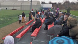 Stadion Miejski w Piasecznie (lub też GOSiR Piaseczno, od którego swoją nazwę wzięły GOSIRKi Piaseczno) jest to wielofunkcyjny obiekt z bieżnią (niestety), tablicą do wyświetlania wyników oraz częściowo zadaszoną trybuną liczącą w sumie 924 czerwone krzesełka. Stadion może poszczycić się naturalną murawą, dość przystępnie położoną klatką dla gości, osobnym stanowiskiem dla spikera oraz treningowym sztucznym oświetleniem. Ale wiecie co? To wcale nie była arena, na której był rozgrywany dzisiejszy mecz. Z bliżej nieokreślonych powodów dzisiejsze spotkanie odbyło się na boisku bocznym, ze sztuczną murawą. Szkoda, że klub nie poinformował o tym w przedmeczowej zapowiedzi (chyba, że coś przeoczyłem) - i bynajmniej nie była to sytuacja awaryjna, ponieważ na głównej płycie nie było jeszcze nawet namalowanych linii. OK, tak więc w niniejszej sekcji mamy do opisania boisko boczne ze sztuczną murawą. I obawiam się, że pierwsze zdanie praktycznie wyczerpało temat - jest to po prostu boczne boisko ze sztuczną murawą. Nieopodal niego znajduje się dość prosta stalowa trybunka licząca ok. 300 czerwonych krzesełek. Jest ona położona całkiem blisko linii bocznej, brak bieżni to chyba jedyny plus faktu, że mecz odbył się na bocznym. Od boiska oddzielał nas tylko chodnik. I siatka. Całe boisko otoczone jest bowiem wysoką siatką do zbierania piłek, która jeszcze dodatkowo odbierała smak życia przyjemność z oglądania meczu. Na domiar złego, skoro mecz został już zorganizowany na bocznym boisku, nie był on biletowany. Nie przywiozłem więc z Piaseczna żadnej piłkarskiej pamiątki.