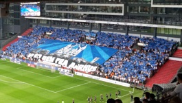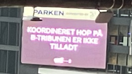 Przed pierwszym gwizdkiem kibice obydwu drużyn zdążyli odpalić też race - w przypadku gospodarzy było to trochę rac oraz niebieskie i białe świece dymne, z kolei goście zaprezentowali najpierw oprawę z kartoniadą, a następnie racowisko z pomniejszą sektorówką z herbem klubu (przebierali się pod nią?) i transparent o treści OG VI ELSKER AGF! (oznacza to chyba mniej więcej my kochamy AGF! ). W trakcie samego meczu gospodarze ograniczali się już tylko do machania flagami, podczas gdy goście kilka minut po golu wyrównującym na 2:2 zaprezentowali kolejne racowisko. Kibice obydwu drużyn prowadzili głośny, żywiołowy doping, ale oczywiście ciężko mi tutaj cokolwiek zacytować, pomijając te momenty, kiedy śpiewali o poszczególnych piłkarzach (np. Di-io-go, Di-io-go, Di-io-go! Di-io-go Gonçalves, Di-io-go! , zapomniałem jednak, w jakim rytmie wyśpiewywano imię i nazwisko Mohammeda Daramy'ego). No i oczywiście, kibice gospodarzy raz na jakiś czas brali się do skoordynowanego podskakiwania po swojej trybunie. Nie jest to oczywiście nic wyjątkowego i nie byłaby to rzecz warta podkreślenia, gdyby nie fakt, że za każdym razem przy tej okazji na telebimach wyświetlano komunikat o treści Koordineret hop paa B-tribunen er ikke tilladt .