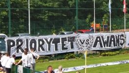 Stawka dzisiejszego meczu była bardzo wysoka, ponieważ wygrana mogła dać piłkarzom Victorii awans do III ligi. Dodatkowym warunkiem, który musiał się spełnić, była utrata punktów przez Mazovię Mińsk Mazowiecki (czyli co najwyżej remis) w równolegle rozgrywanym meczu z rezerwami Wisły Płock. Jeszcze przed meczem na ogrodzeniu za linią końcową boiska wisiał duży transparent PRIORYTET VS AWANS (od razu wyjaśniam - VS oznacza w tym przypadku Victorię Sulejówek ). Fani Victorii byli ulokowani na północnym skraju trybuny, w większości ubrani na biało. Na początku meczu zaprezentowali oni oprawę, której elementami były transparent o treści graMY o aVanS , biała sektorówka i, skoro sektorówka, to również race.