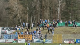 Mecz zgromadził całkiem dużą liczbę widzów, którą jednak bardzo trudno jest mi oszacować ze względu na specyficzny układ stadionu i tego, że znaczna część widzów nie była na żadnym sektorze, tylko oglądała mecz stojąc na wale ziemnym (tak jak zresztą ja). Na potrzeby chomiczej relacji przyjąłem, że widzów było łącznie ok. 500. Pierwszą połowę oglądałem w pobliżu sektora fanatyków, na którym znajdowały się dwie flagi Cariny oraz kilkudziesięciu fanów w barwach, którzy od początku meczu prowadzili dobry doping przy akompaniamencie bębna. Wykrzykiwali takie hasła jak Carina Gubin! , MKP, MKP , UCG, UCG (chodziło zapewne o Ultras Carina Gubin), czy Zieloni, Zieloni! . Z dłuższych piosenek, śpiewano takie rzeczy jak: Carina MKP, z Tobą po życia kres! Na dobre i na złe będziemy wspierać Cię!