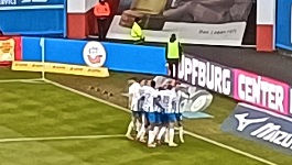 W drugiej połowie Hansa raczej kontrolowała przebieg gry i strzeliła nawet kolejne dwa gole, choć akurat żaden z nich nie został uznany. Pierwszy padł na początku 2. połowy w wyniku katastrofalnego rozegrania wznowienia gry - jeden z obrońców zagrał z piątego metra do Gorki, a bramkarz Sandhausen przy próbie dalekiego zagrania... nie trafił nogą w piłkę. Futbolówkę przejął Christian Kinsombi i spokojnie wszedł z nią do bramki, jednak sędzia nie uznał tego gola, wskazując, że w momencie wznowienia gry Kinsombi wbiegał już w pole karne gości (patrząc na powtórki, nie jestem przekonany). Druga z nieuznanych bramek padła pod koniec drugiej połowy - jeden z graczy Hansy zagrał lagę z rzutu wolnego w kierunku pola karnego gości, piłkę zgrał głową Ryan Naderi, a Tim Krohn pokonał Gorkę strzałem po ziemi. Sędzia uznał jednak (tym razem już bez większych kontrowersji), że Naderi w pojedynku główkowym wygrał pozycję, odpychając obrońcę gości. Wynik nie ulegl już zmianie i Hansa bezpiecznie dociągnęła korzystny rezultat do końcowego gwizdka.
