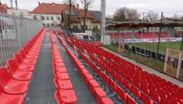 A więc stadion składa się aktualnie z dwóch trybun - z trybuny prostej (położonej od zachodniej strony boiska), która jest w pełni zadaszona i całkiem estetyczna (dzięki wykończeniu tego zadaszenia drewnem). Jest ona jednocześnie dość ciasna - zarówno niezbyt wysoka, jak i położona bardzo blisko boiska (z tego co widzę, pomiędzy pierwszym rzędem a bandami reklamowymi jest zaledwie wąski chodnik). W centralnej stronie trybuny znajduje się na niej pewnego rodzaju dobudówka z przeszkloną ścianą, która prawdopodobnie pełni funkcję loży VIP (tak przynajmniej strzelam, bo nie chciało mi się tego weryfikować). Drugą trybuną jest południowa trybuna zabramkowa - jest to typowa metalowa konstrukcja. Nie jest ona zadaszona, ale jest wyższa od trybuny prostej, dzięki czemu z najwyższych rzędów wszystko widać całkiem nieźle. Wszystkie krzesełka na stadionie są w kolorze czerwonym. Z innych istotnych elementów, na stadionie znajduje się jeden telebim (w rogu boiska) i cztery maszty oświetleniowe. Na stadionie nie było sektora gości, choć goście z Gliwic i tak zostali nieoficjalnie zaproszeni na skrajny sektor trybuny zabramkowej. Po spadku do I ligi w Niepołomicach zalegalizowano tę praktykę, ponieważ sektor ten został ogrodzony i od tego czasu funkcjonuje już oficjalnie jako miejsca dla gości.