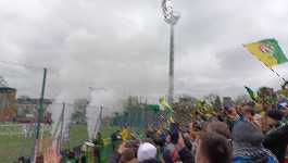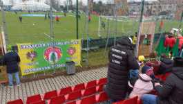 Nie jestem wielkim entuzjastą oglądania meczów z perspektywy trybuny zabramkowej - po pierwsze ze względu na dużo gorszą widoczność (co prawda zwykle wiąże się to z niższą ceną biletu - ale przecież nie po to jechałem przez pół Polski, żeby na koniec zaoszczędzić 10 złotych), a po drugie, ze względu na to, że jest to zazwyczaj miejsce dla fanatyków, gdzie znajduje się młyn. Nie miałem jednak wyboru, ponieważ była to jedyna trybuna, na której były dostępne miejsca w momencie gdy przeklikiwałem się przez system biletowy na parę tygodni przed meczem. Oznaczało to, że w trakcie meczu musiałem włączyć się w doping i wspierać Puszczę wraz z młynem - przyznam, że była to przyjemna okoliczność, która sprawiła, że godnie przeżyłem doświadczenie, jakim bylo oglądanie Ekstraklasy w Niepołomicach. I z tego co widziałem, nie byłem jedynym futbolowym turystą na dzisiejszym meczu - parę rzędów przede mną na trybunie znajdował się choćby gość w kurtce z napisem NAJWIĘKSZY KIBIC EKSTRAKLASY NA ŚWIECIE .