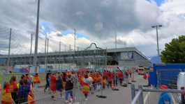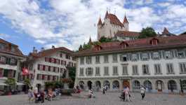 Mój dzień meczowy w Thun zaczął się od wizyty w znajdującej się w centrum miasta Strefie Kibica. Co ciekawe, inaczej niż w Niemczech (gdzie do Strefy Kibica nie wpuszczano nawet z plecakami i to nawet w przypadku gdy waszmość posiadał dostatecznie jasną karnację), nie była ona w żaden sposób zabezpieczona i wchodziło się tam po prostu z marszu, niczym na lokalny jarmark. Na kibiców w Fan Zone czekały różnego rodzaju interaktywne atrakcje, a także stoiska z przekąskami i napojami, a czas umilała niezbyt dobra popowa muzyka. Nie zabawiłem tam zbyt długo ze względu na dość duże zagęszczenie ludzi i generalną ciasnotę, ale zdążyłem zauważyć, że kibiców reprezentacji Hiszpanii jest w Thun zdecydowanie więcej niż Belgów.
