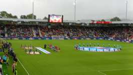 W dzisiejszym meczu był tylko jeden faworyt. W pierwszej kolejce spotkań grupy B Hiszpanki rozjechały Portugalki 5:0, pokazując totalną dominację nad rywalkami, z kolei Belgijki przegrały 0:1 z Włoszkami (ale nie wiem w jakim stylu, bo nie oglądałem tego w TV). I rzeczywiście, od samego początku wydarzenia działy się głównie pod naszą bramką (tzn. tą, którą w pierwszej połowie atakowały Hiszpanki i która znajdowała się nieopodal mojego miejsca na trybunie). Belgijki broniły się nawet sensownie, jednak w 22. minucie Hiszpanki rozgrały świetną kombinację i rozmontowały ich obronę po raz pierwszy. Patri Guijarro zagrała do Vicky López, ta do Alexii Putellas, a napastniczka Barcelony (w sumie to wszystkie te trzy piłkarki grają w Barcelonie) pokonała strzałem w długi róg Lisę Lichtfus. Co ciekawe, zaledwie dwie minuty później... Belgijki wyrównały. Z kornera wrzuciła Tessa Wullaert, a Justine Vanhaevermaet strzałem głową w krótki róg pokonała Adrianę Nanclares (o ile się nie mylę, był to pierwszy strzał Belgijek w tym meczu). Hiszpanki wyszły ponownie na prowadzenie dopiero w 39. minucie, gdy Irene Paredes wykończyła głową dośrodkowanie z kornera Claudii Piny. Do przerwy było 2:1 dla Hiszpanek.